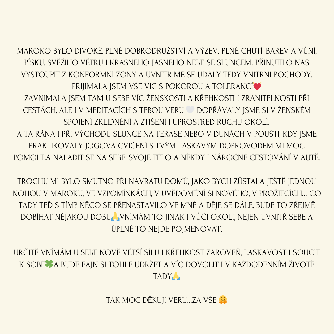 Vše plyne jinak. Netřeba se snažit. Tady prostě JSI sama sebou, tady prostě jsi TADY a TEĎ. Tady to prostě jinak ani nejde :)
